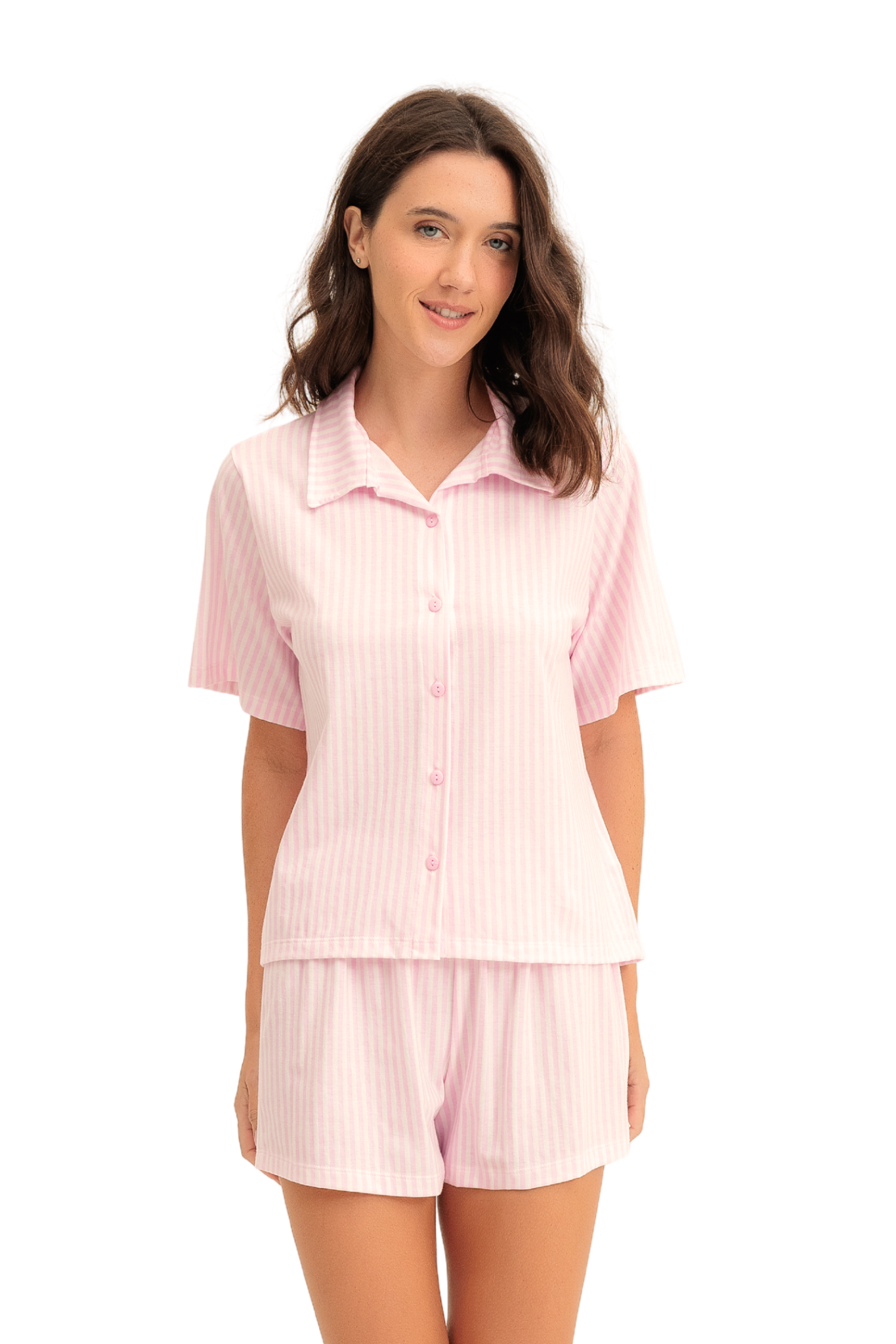 Leveza, conforto e feminilidade definem o nosso pijama de abertura manga curta com short em Malha Comfort, ideal para quem busca praticidade sem abrir mão do charme nos momentos de descanso. Com toque macio, frescor e excelente caimento, o conjunto é todo estampado com listras verticais em tom rosa sobre fundo off-white, trazendo um visual delicado e atemporal. A blusa de manga curta com abertura frontal possui gola tradicional e fechamento por botões no mesmo tom das listras, facilitando o vestir e conferindo um toque clássico à peça. Já o short, no mesmo tecido e estampa, possui elástico na cintura de 2 cm, proporcionando ajuste confortável e seguro.